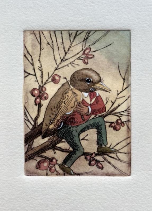 Small 4to.; publisher’s deep red cloth with small etched paper label featuring a bird’s nest inlaid to upper cover, hand-marbled endpapers, housed in original red cloth slipcase; pp. [36], printed on fine handmade cream card, fore- and lower edges untrimmed; title-page with a small onlaid and handcoloured engraving; with 7 additional striking original etchings, each carefully handcoloured by the artist and guarded by tissue; with beautifully typeset prose in dark green and deep red, and decorative printed borders in sepia; a fine copy, as new.