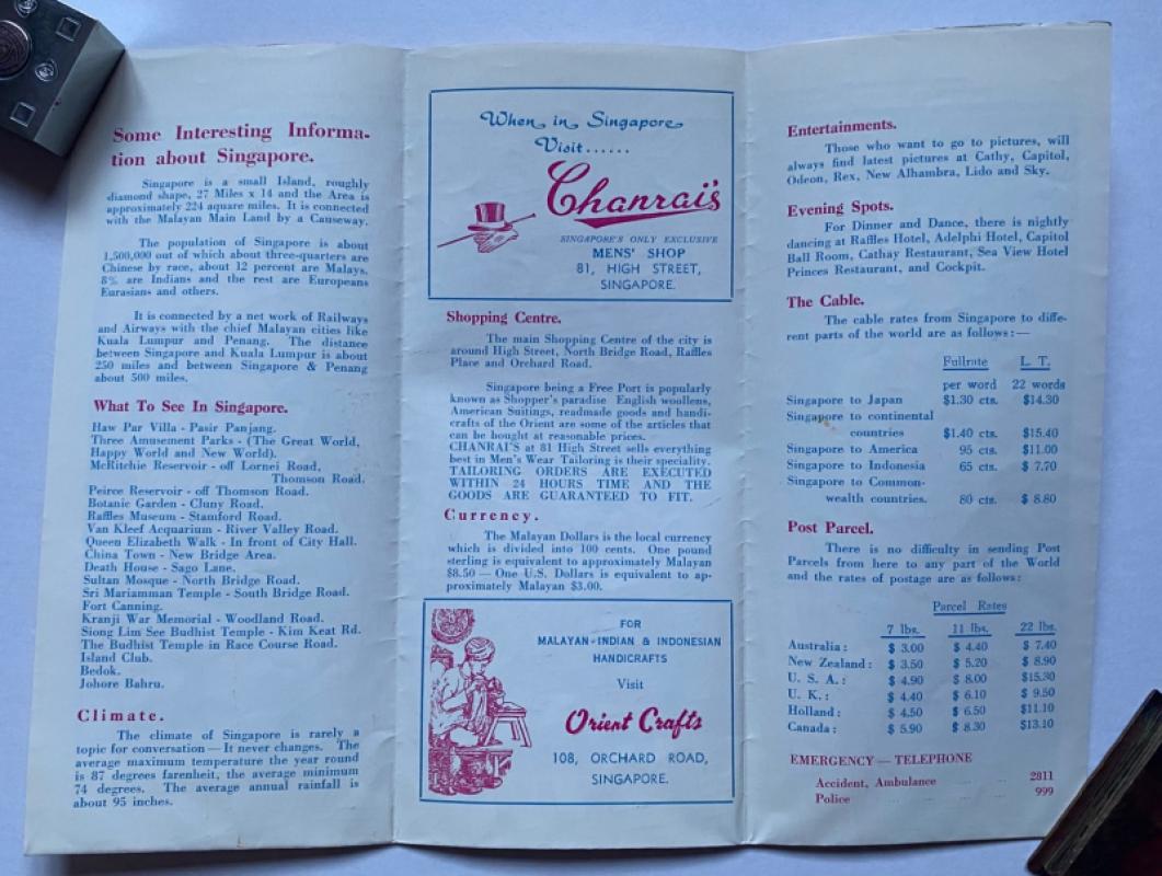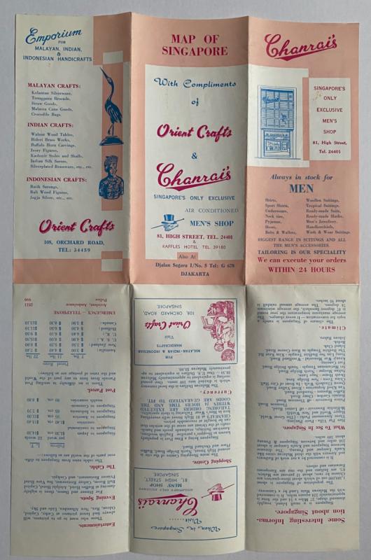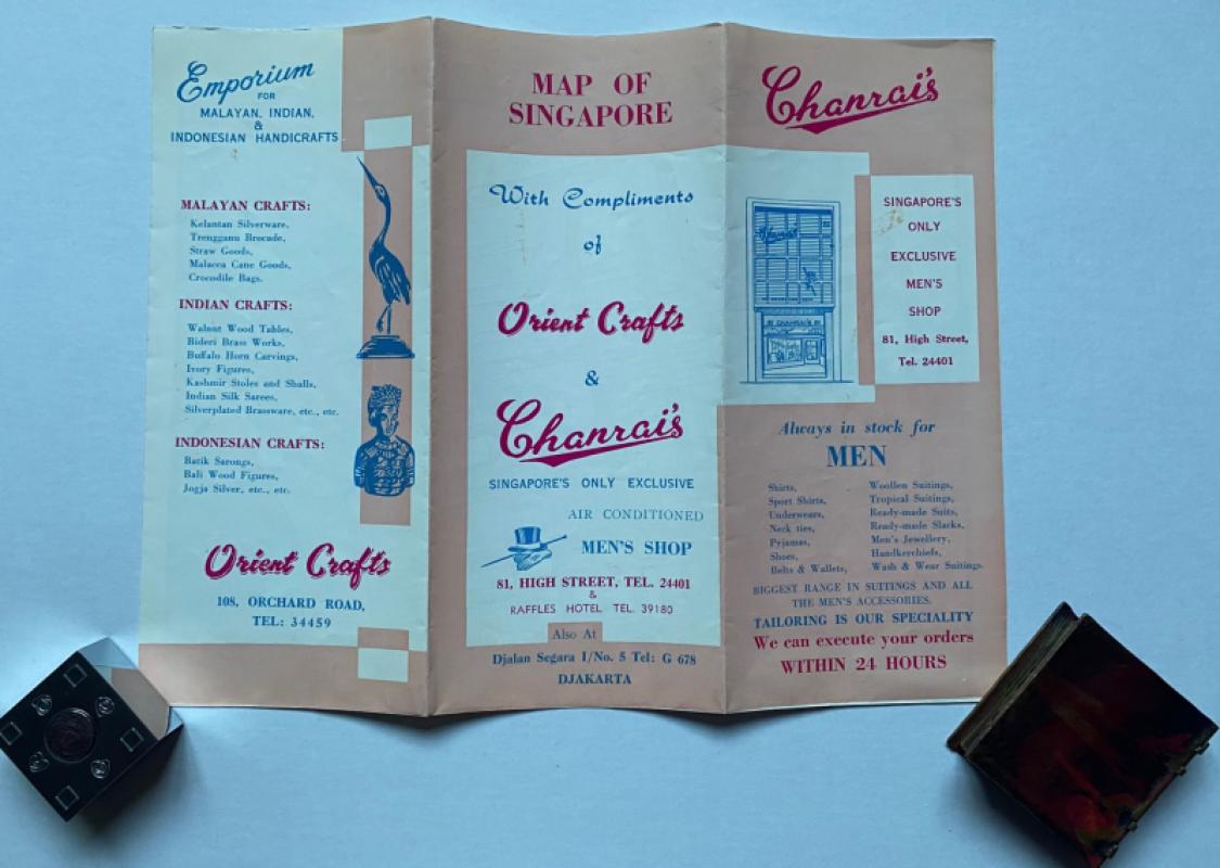 Map of the City of Singapore adapted from a Survey Department map and printed by Weng, Singapore for Orient Crafts and Chanrai’s circa 1960. On paper size 45 by 30 cm. Covers an area from Balestier Plain in the north across to Merdeka Bridge and in the south from Poh and Outram Roads to the Telok Ayer Basin. Colour. With a numbered key to 29 features on the map including various hotels, the BOAC, KLM, Quantas and Garuda airlines offices, YMCA. several theatres including the Rex and Odeon, the aquarium, Raffles Museum and Library, government and council offices. Other landmarks featured include the Prison, the Chinese Commercial School, parks, Fort Canning, the Clyde Terrace Market and police stations and barracks. The map was made to promote two local busineses, Chanrai’s menswear shop and Orient Crafts of Orchard Road. Details of both firms are on the reverse, along with the proud boast on the part of Charai’s that it is Singapore’s only exclusive air-conditioned men’s shop. Has been folded. A little period gem. VG condition.
