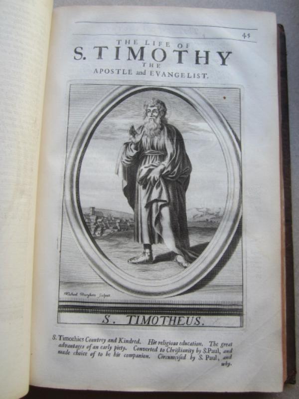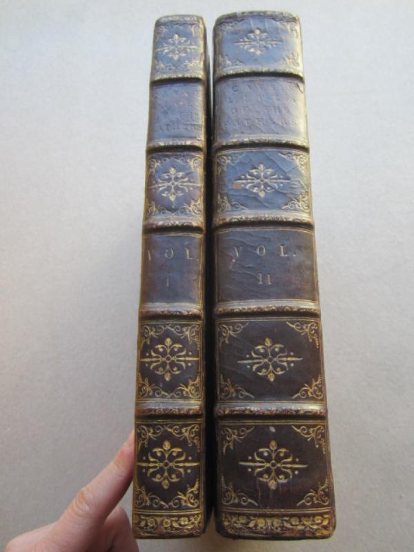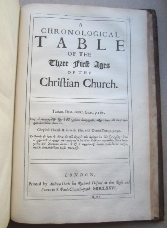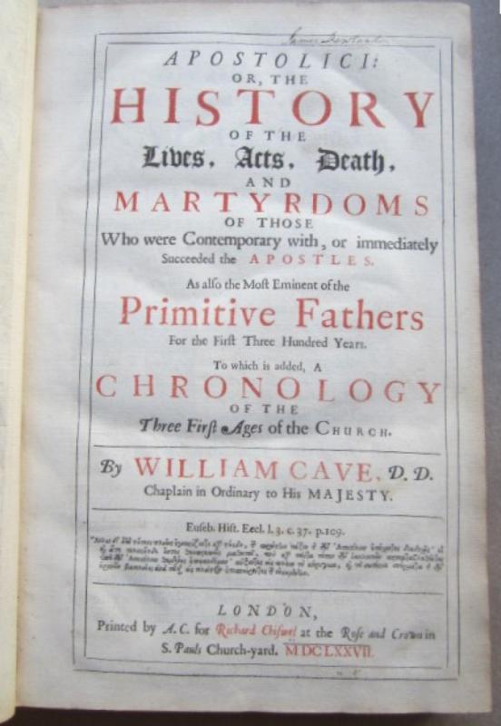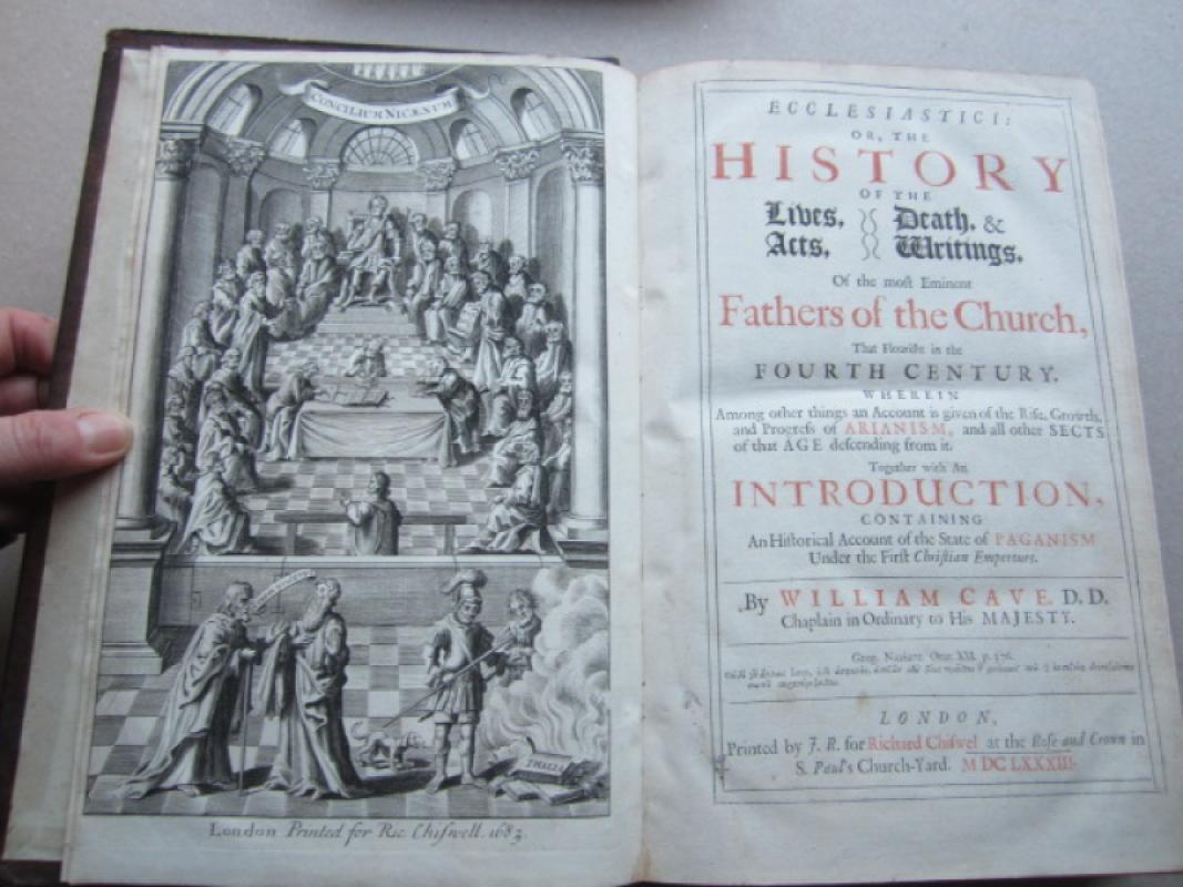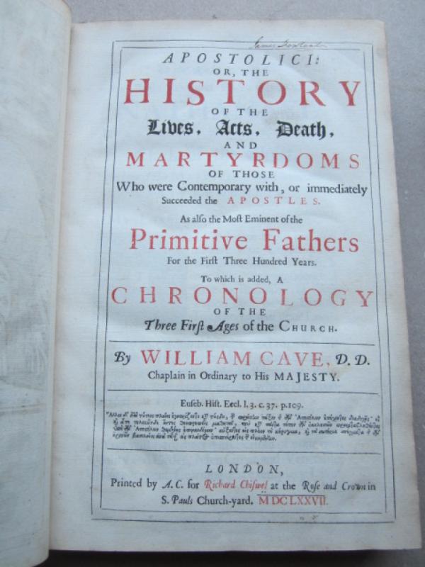 Two Volumes, Vol 1: Apostolici: Or, The History of The Lives, Acts, Death, and Martyrdoms of Those Who Were Contemporary With, Or Immediately Succeeded The Apostles ... As Also The Most Eminent Of The Primitive Fathers For The First Three Hundred Years, To Which Is Added, A Chronology Of the Three First Ages Of The Church, (32) + xxxii + 335pp, additional engraved title, main title printed in red and black, splendid engraved copper plates, bound in full polished calf, gilt decorated spine, raised bands, lacks title labels on spine, hinges strong and firm, some minor random water staining but not serious or offensive, Provenance: previous owner's name stamp within: 'B. C. Ravenhill ... Gloucester' and a contemporary handwritten inscription, Richard Chiswel, London, 1677. Vol 2: Ecclesiastici: Or, The History of The Lives, Acts, Death, & Writings Of The Most Eminent Fathers of The Church, That Flourisht In The Fourth Century. Wherein Among Other Things An Account Is Given Of The Rise, Growth, And Progress Of Arianism, And All Other Sects Of That Age Descending From It. Together With An Introduction, Containing An Historical Account of The State of Paganism Under The First Christian Emperours [WITH] An Appendix: Containing A Brief Account of Some Other Eminent Fathers That Florish'd In This Fourth Century, (48) + lxxi + (i)+ 543 + (i), engraved frontispiece, title printed in red and black, splendid engraved copper plates, Printed by J. R. for Richard Chiswel, London1683; with appendix at rear of Vol 2 titled: 'Containing a Brief Account of Some Other Eminent Fathers That Florish'd in The Fourth Century' (ii) + 61 (misnumbered 57) + (i), printed by A. Godbid and J. Playford, London, 1682, bound in full polished calf, gilt decorated spine, raised bands, title labels lacking, hinges strong and firm, minor water staining but not offensive, Provenance: previous owner's name stamp within: 'B. C. Ravenhill ... Gloucester' and written in contemporary hand on the title page: James Dowland. * two matching volumes in excellent condition, internally very clean and crisp. Rarely found in such good shape. William Cave (1637–1713), English divine, educated at St John's College, Cambridge. (CAT 22/1254)