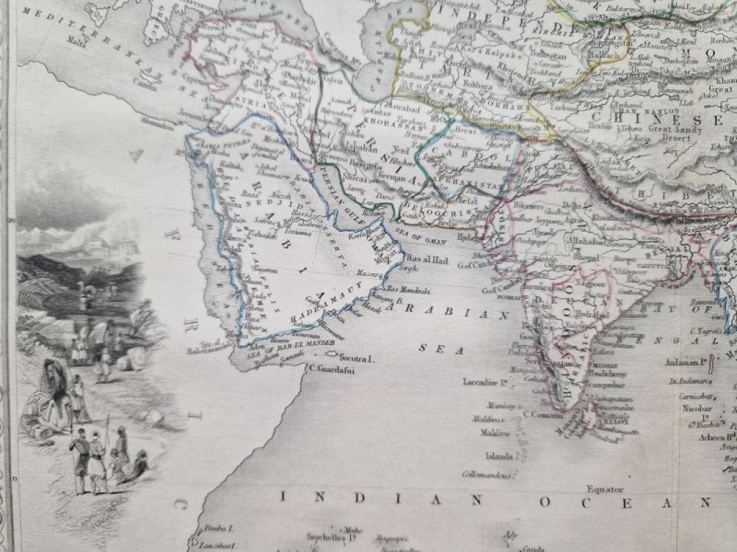 The map shows the whole of the Asian continent, and is surrounded by a very decorative border. Some vignettes within the image, depicting indigenous animals, various costumes and sites.