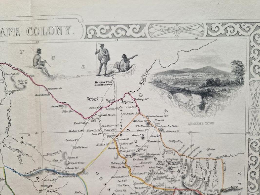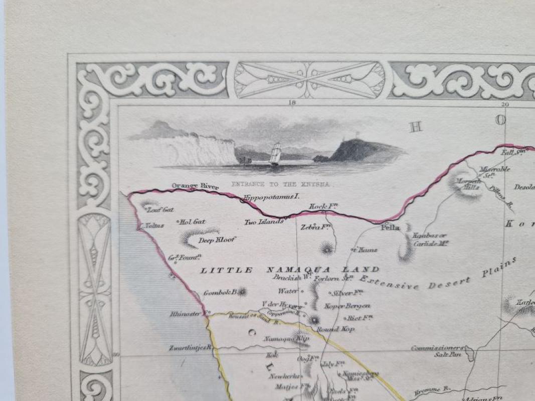 The map shows Southern Africa with Cape of Good Hope and Cape Town; it is surrounded by a very decorative border, and some vignettes within the image, depicting indigenous animals, various costumes and sites.