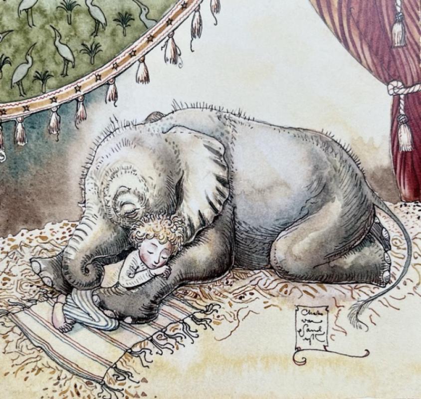 Large 8vo.; publisher’s burnished antique gold card wrappers over integrated metallic blue boards, hand-sewn in the studio, upper cover exquisitely blocked in colours surrounding an onlaid pictorial label above the onlaid decorative title, wide gold inner flaps also beautifully printed in a feast of colour with an all-over butterfly design; [vi], 3-16 + [iv], on fine Kipling soft mould-made stock; the text decorated with triple-line rules, brackets, and decorative initials in sang de boeuf, with decorated title-page in colours, 4 onlaid pictorial plates mounted on Stardream Old Gold paper from Italy within colour-printed borders, 3 full-page coloured plates, including the double-page centrefold, and another full-page plate in line; additionally two half-page “tickets”, one for the Steamship and another for the Zoo; fine, as new.