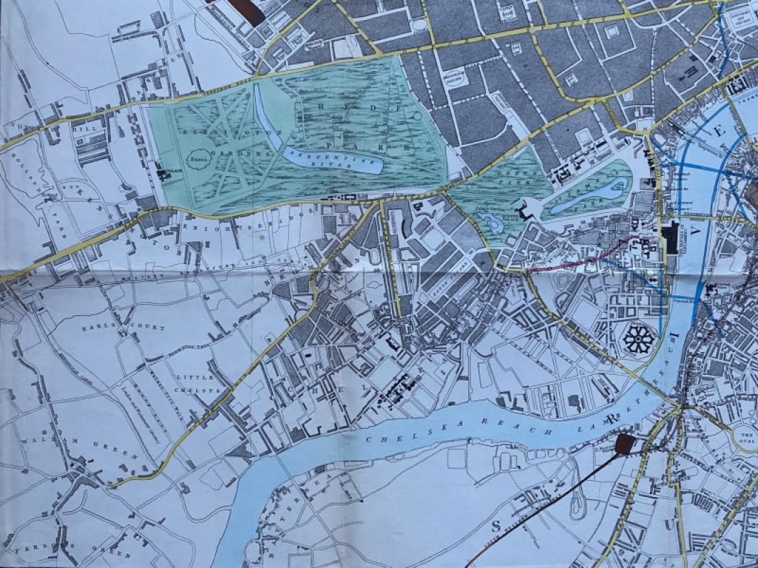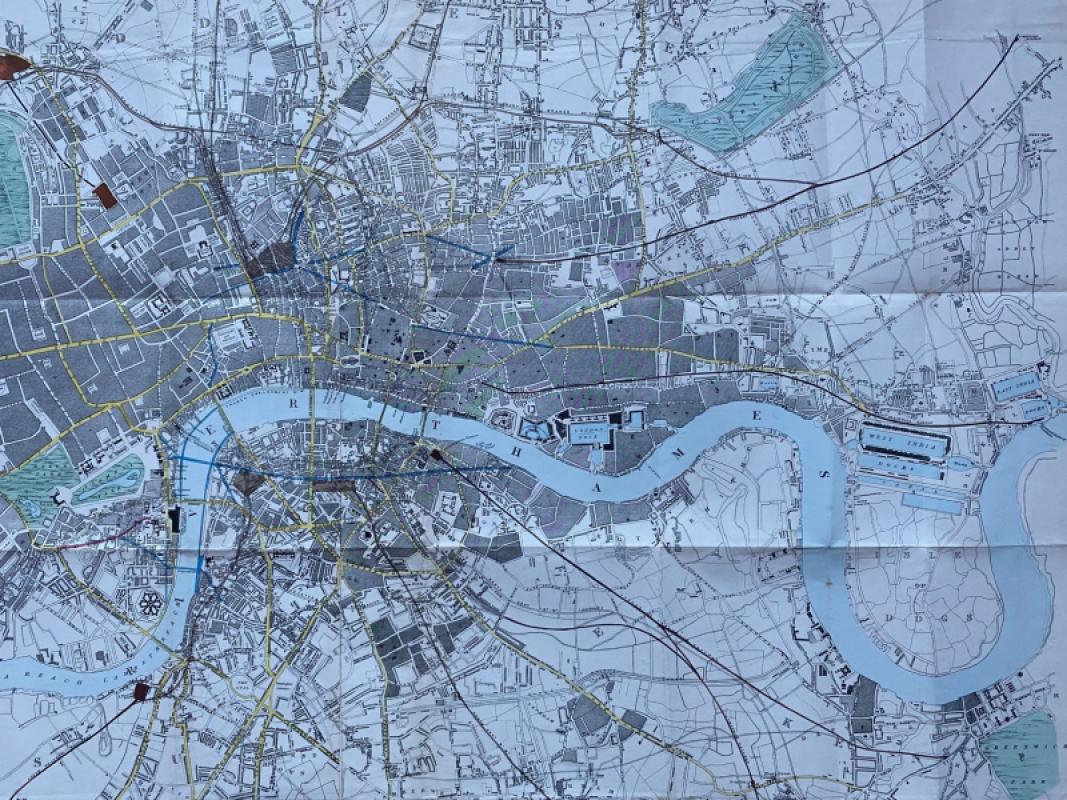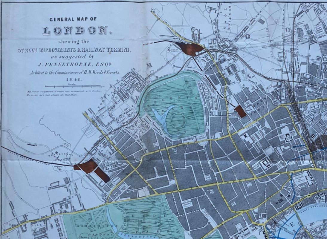 General Map of London: the Street Improvements and Railway Termini as suggested by J Pennethorne Esq. Architect to the Commission of HM Woods and Forests and published by Hansard for the House of Commons, London 1846. On paper size 95 by 55 cm. Scale two furlongs to the inch or four inches to the mile. Hand coloured. The map shows London in considerable detail with the addition of some new railway lines that were intended to link the existing termini and possibly connect with a new central terminus. All the existing main line stations are here, though some are not yet in their eventual locations. This is London as it was in the middle of the first burst of railway mania, with the city already carved up by the creation of the new lines and faced with the prospect of more. Pennethorne was both an architect and an urban planner and responsible for several schemes to redevelop London in the 1840s. Has been folded. Good to VG condition.