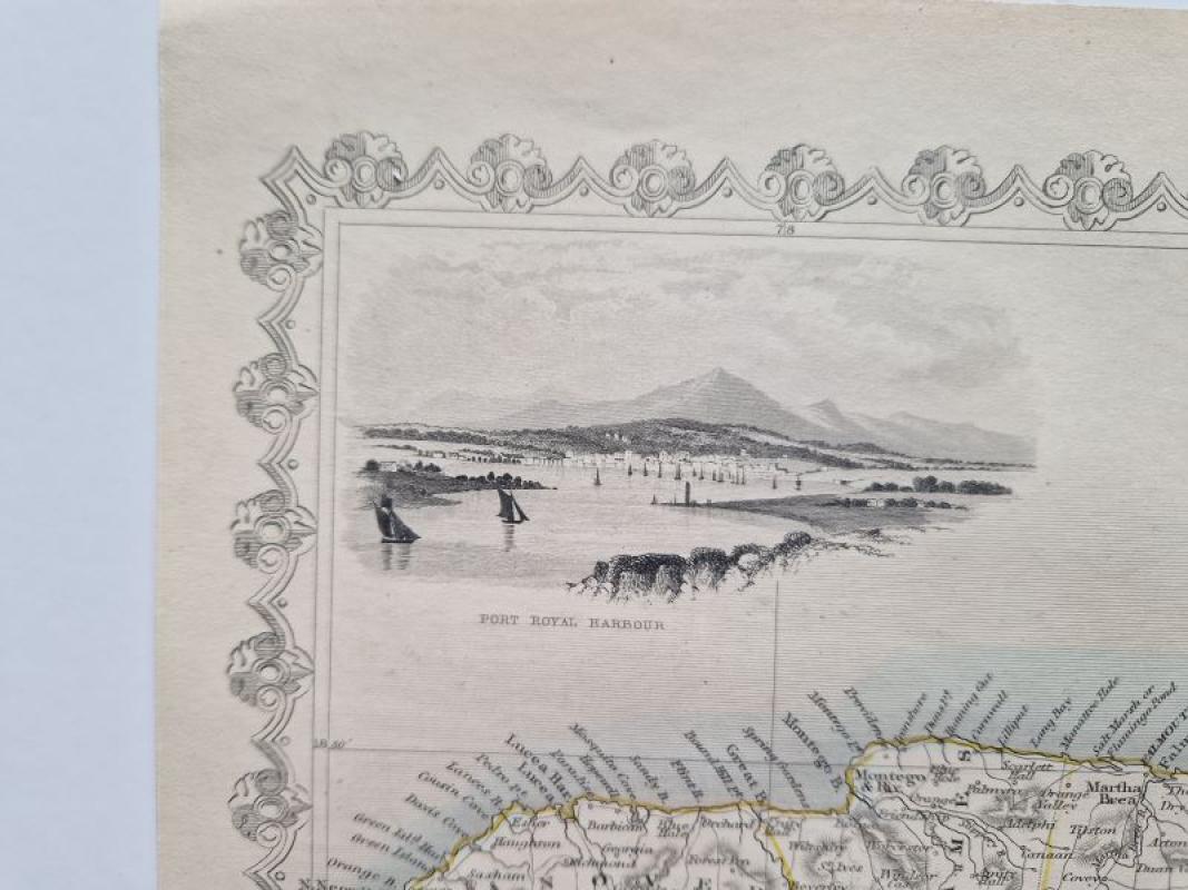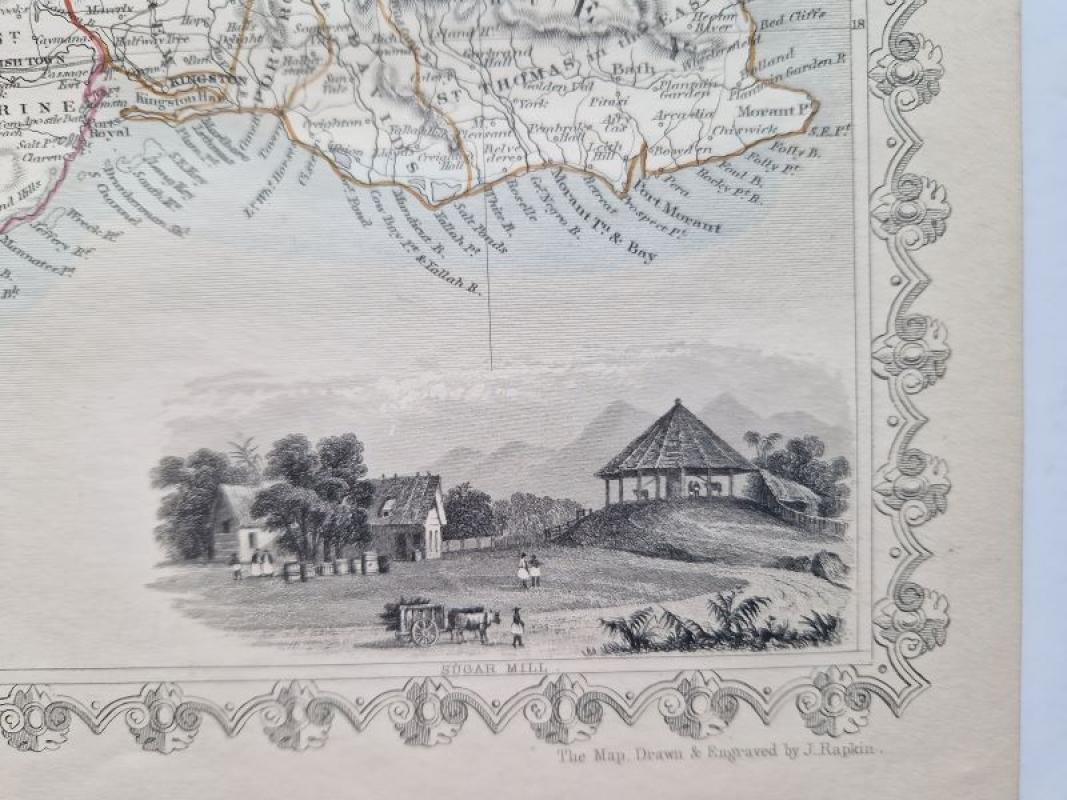 The map shows the whole of Jamaica; it is surrounded by a very decorative border, and some vignettes within the image, depicting indigenous animals, various costumes and sites.
