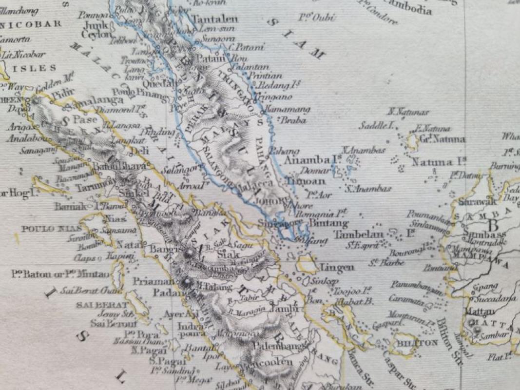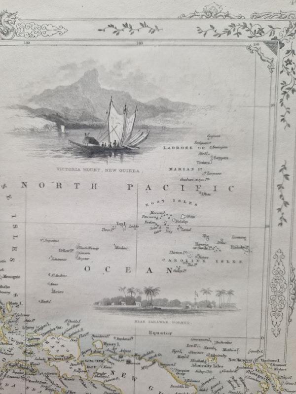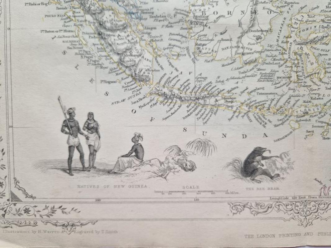 The map shows the South East Asia; it is surrounded by a very decorative border. Some vignettes within the image, depicting indigenous animals, various costumes and sites.