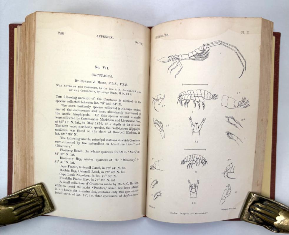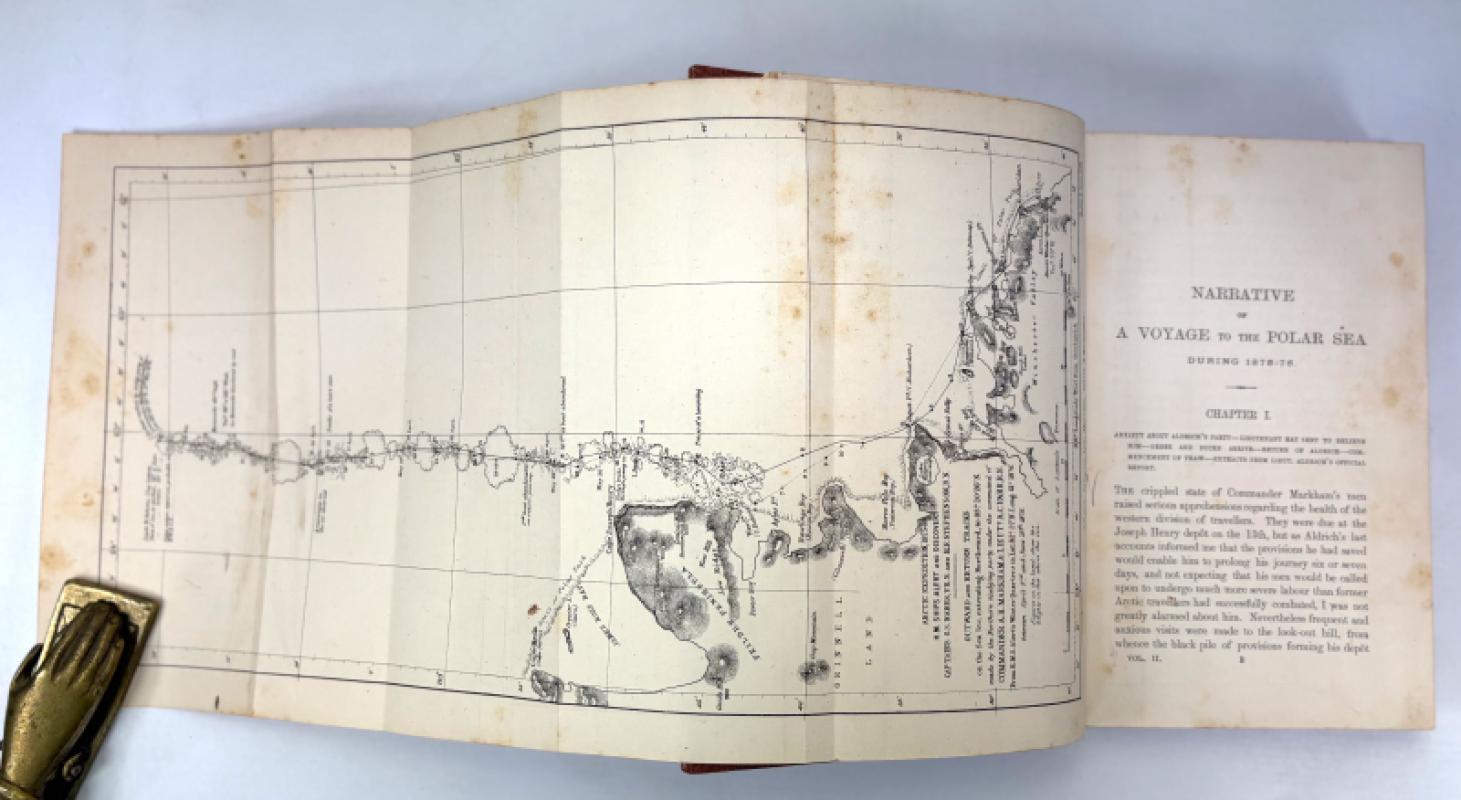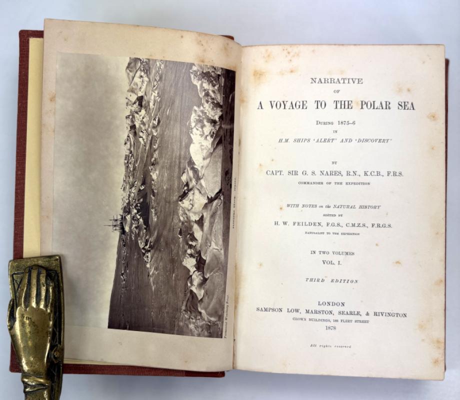 A cornerstone account of one of the most ambitious Arctic undertakings of the nineteenth century, Sir George Naress Narrative of a Voyage to the Polar Sea documents the 1875–76 British expedition in H.M. Ships Alert and Discovery. Conceived to push farther north than any previous attempt, the expedition combined geographical exploration with extensive scientific observation, charting new high-latitude regions while conducting studies in geology, zoology, meteorology, and sea-ice conditions. Nares's detailed narrative, together with Feilden's natural history notes, offers a vivid record of extreme polar travel, overwintering in the High Arctic, sledge journeys toward the Pole, and the challenges faced by crew and scientists alike. Long regarded as a classic of polar exploration literature, the work stands as both an important historical document and a compelling chronicle of human endurance at the edge of the known world. Narrative of A Voyage to the Polar Sea During 1875-6 in H.M. Ships 'Albert' and 'Discovery', by Capt. Sir G.S. Nares, R.N., K.C.B., F.R.S., Commander of the Expedition. With Notes on the Natural History edited by H.W. Feilden, F.G.S, C.M.Z.S., F.R.G.S., Naturalist to the Expedition. In Two Volumes (complete). Published by Sampson Low, Marston, Searle, & Rivington, London 1878. Third Edition. A very good, handsome, set of 2 volumes which have been expertly rebound with tan leather spines with raised bands and gilt titles, with brown linen over boards. With light wear and bumping. Soundly bound, with new cream endpapers and rear pocket to volume I. The text is very good throughout. Clean and bright with just occasional scattered spotting. The woodburytype photographic prints are particularly striking. There is some light staining (mostly to the top margin) to a few of the Plates in Volume II. The bound-in fold-out map in Vol II has no tears. The large fold-out map housed in the pocket of Vol I has neat tape repairs to the rear, but the map presents nicely. A desirable set of this classic polar text. Text in English. Vol I: xl + 395pp + 3 Photographic plates + 1 Illustrated Plate + fold-out map in pocket at rear;  Vol II: viii + 378pp + 3 Photographic plates + 6 Illustrated Plates + fold-out map near the front.  With additional illustrations in the text. All images present as called for. Dimensions: each volume approx 225mm high x 150mm wide x 40mm deep. Weight: approximately 2.04kg (the set - unpacked).