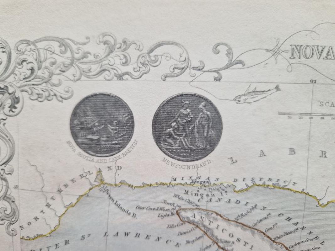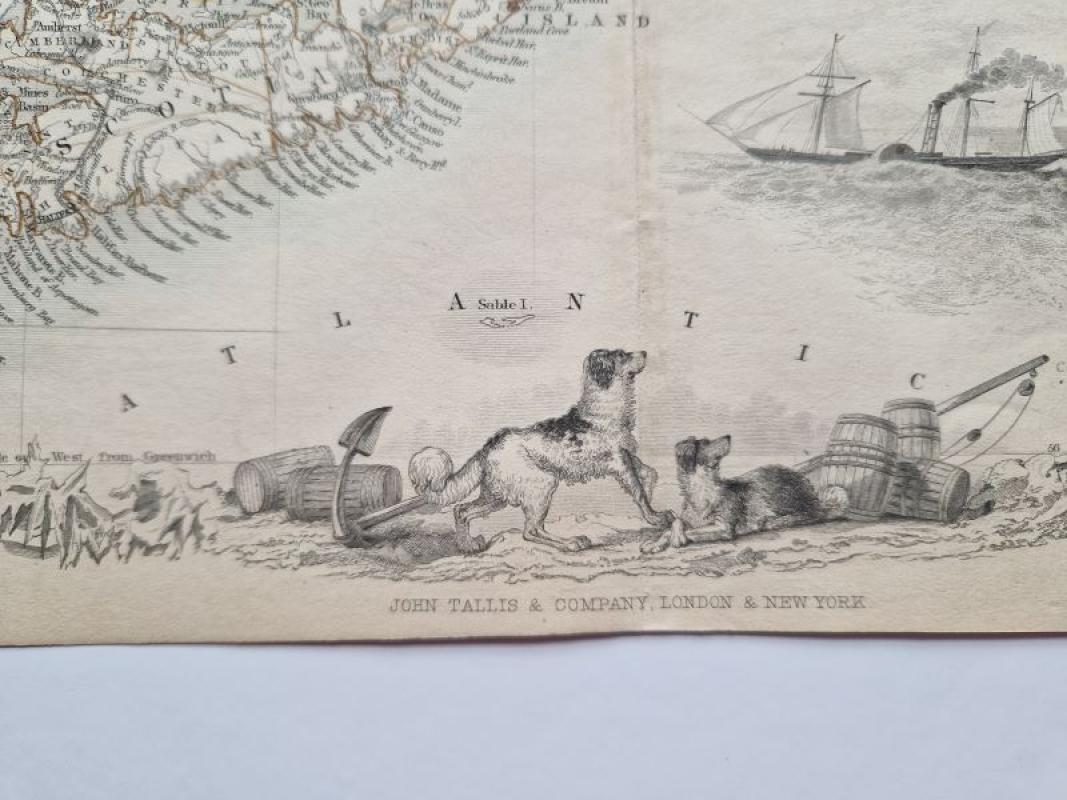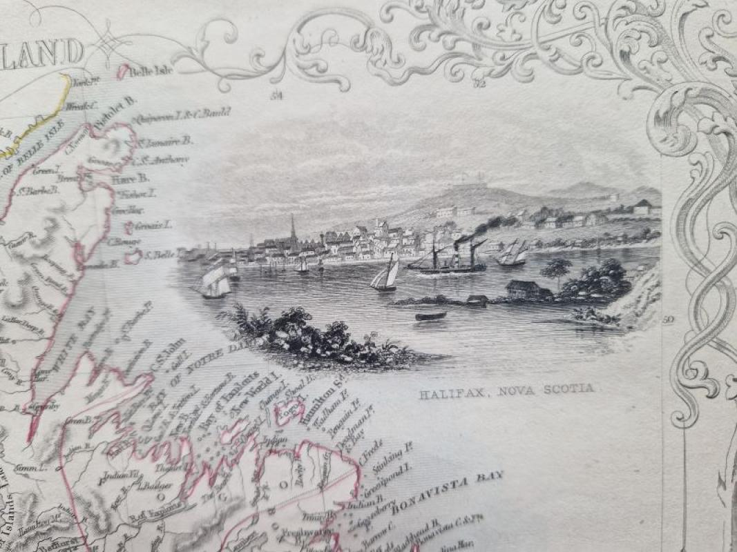 The map shows Nova Scotia and Newfoundland, with a lovely depiction ofd Newfoundland dogs and Halifax. It is surrounded by a very decorative border, and some vignettes within the image.