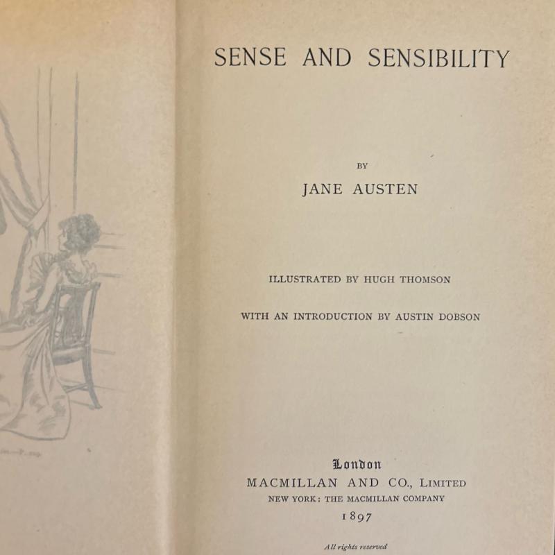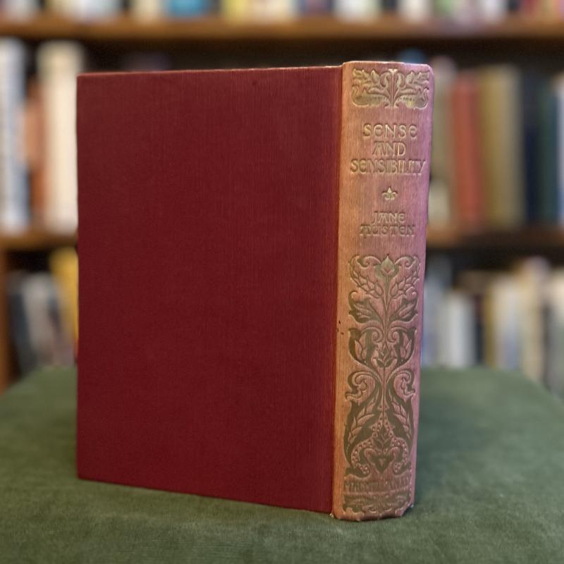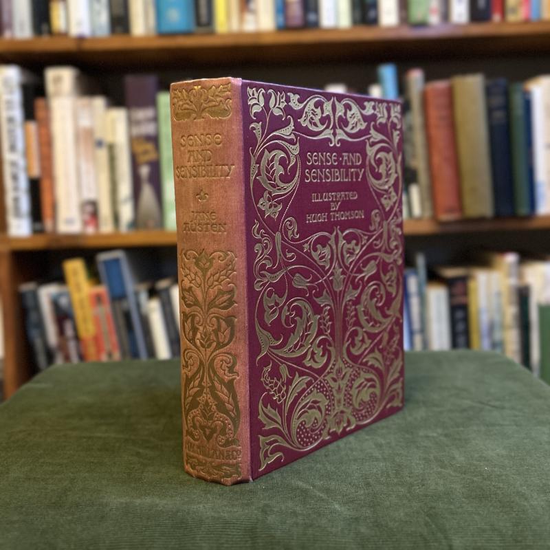 This beautifully produced copy of Austen’s first published novel Sense and Sensibility is complete in a single volume and features a number of black and white illustrations by Hugh Thomson, the Victorian Irish artist made popular for his pen-and-ink illustrations of classic works of literature. This edition with Austin Dobson’s introduction, part of the “Macmillan’s Illustrated Standard Novels,” is a reprint of the first Thomson edition published a year earlier, and it features striking gilt floral ornamentation to the front cover and yellow endpapers with peacock illustrations that evoke Thomson’s iconic “peacock edition” of Pride and Prejudice.