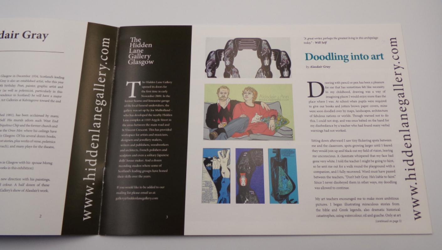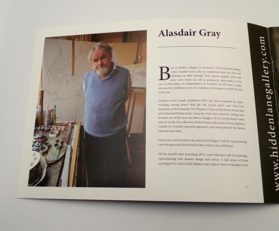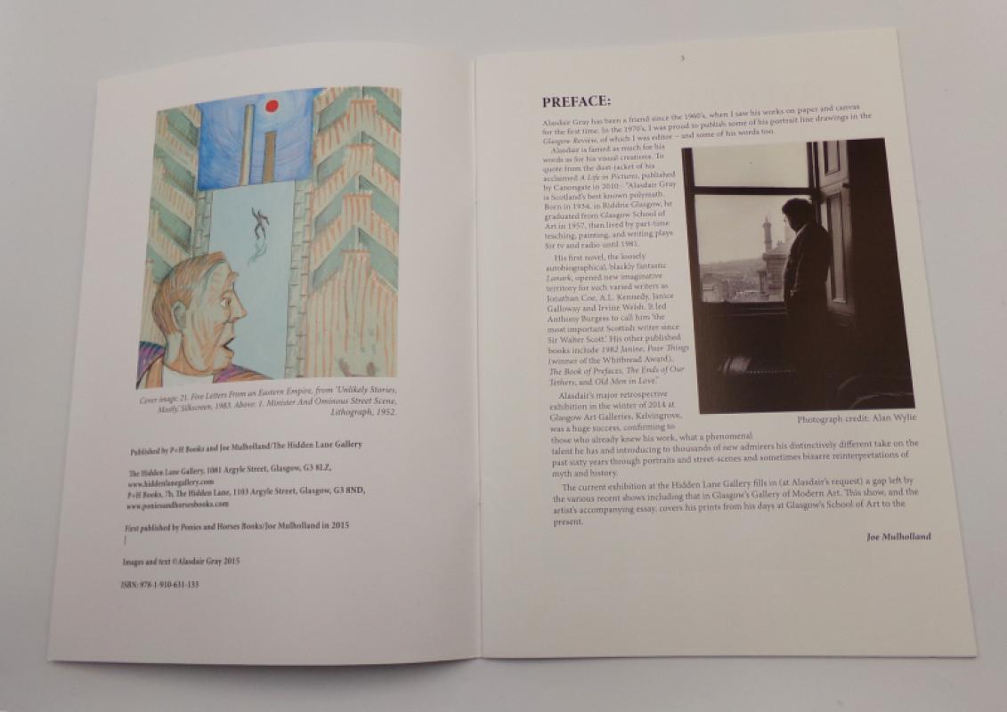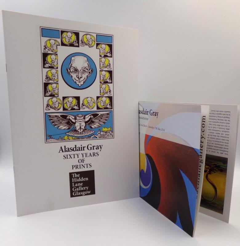 GRAY, Alasdair. Sixty Years of Prints. Glasgow: P+H and Joe Mulholland/ The Hidden Lane Gallery 2015. Preface by Joe Mulholland. Colour images and texts by Alasdair Gray. Selling catalogue of works by Alasdair Gray. Invitation card for private view, laid in. Further catalogue from 2014 joint exhibition laid out tête-bêche of works by Alasdair Gray and Franketienne with 500+ word text by Gray titled ‘Doodling into Art’, again published by The Hidden Eye Gallery. Original pictorial wrappers. All items Fine condition, in plastic pocket, as issued.