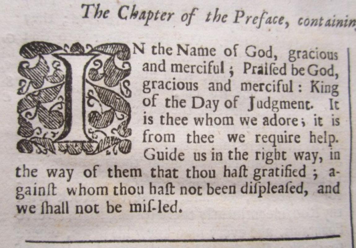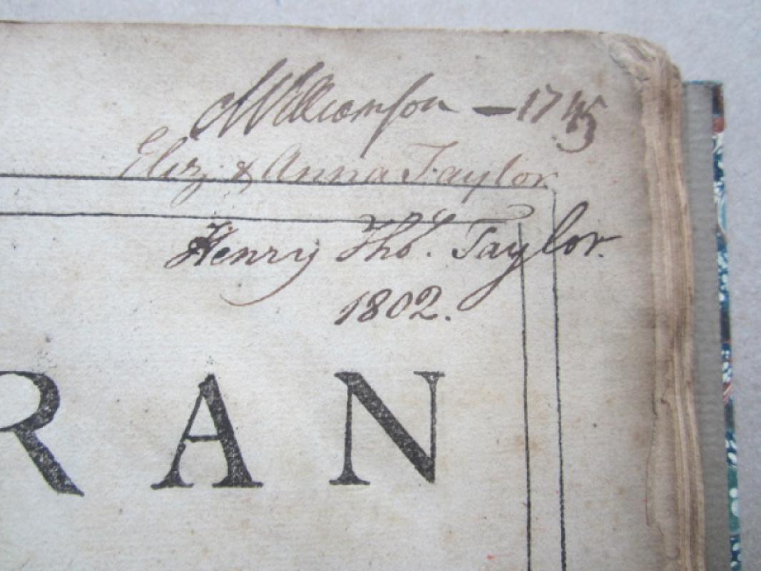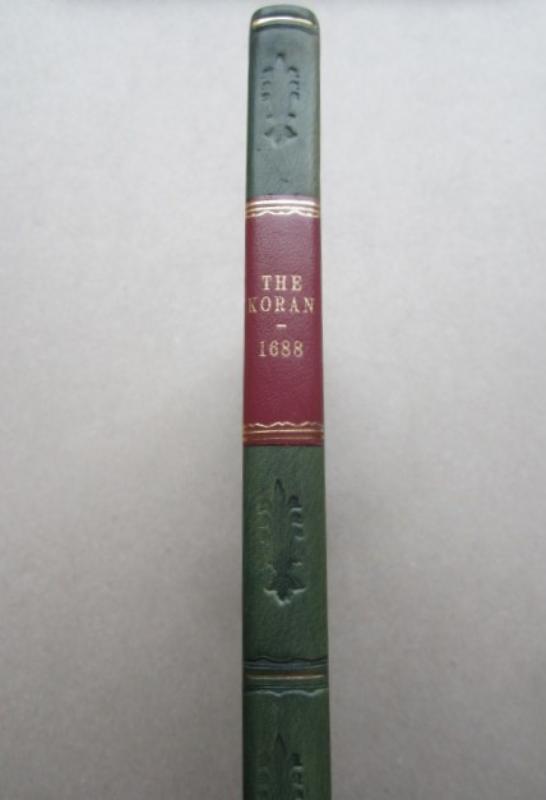 Second Edition, (vi) + xiv + 128pp, printed in double columns, hardcover, 4to, expertly re- bound in new old style quarter green calf with marbled boards, gilt lined spine, title label inset on maroon morocco with gilt lettering, new endpapers, pages slightly browned, foxed and crinkled but a good copy in good condition, Provenance: with three ownership names on the title page: 'M. Crompton - 1745, Eliz. & Anna Taylor, Henry Tho. Taylor 1802,' Printed, And Are To Be Sold by Randal Taylor, London, 1688. * first English translation of the Koran - Second Edition, but still scarce and valuable. (BIG/10)