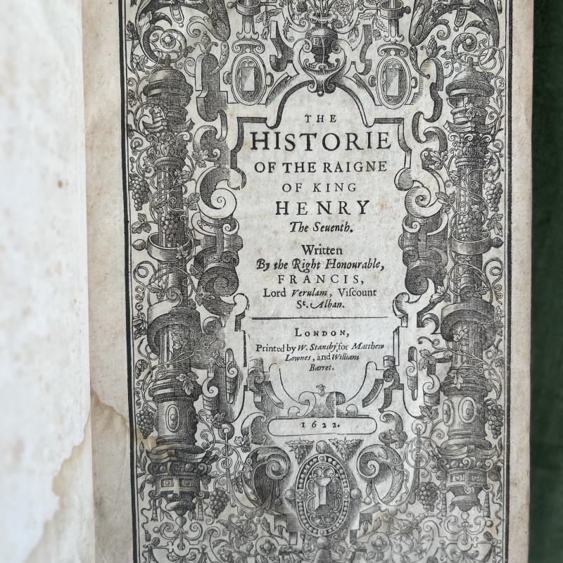 A remarkably well-preserved first edition of English essayist and statesman Sir Francis Bacon’s influential history of the reign of the first Tudor monarch Henry VII, published shortly after James I arranged Bacon’s release from the Tower of London. Bacon’s Historie revolutionized contemporaneous accounts of the life of James I’s royal predecessor, descrying that “None of the histories which had been written before conveyed any idea either of the distinctive character of [Henry VII] or the real business of his reign.” Bacon’s only completed work of history, the volume set the standards for historical accuracy for at least three centuries following its publication and helped to vault Bacon out of political exile. This copy lacks John Payne’s frontispiece portrait plate with the text retaining the uncorrected errata with seven “faults escaped” listed on p. 248 in addition to “souldiers” on p. 3.