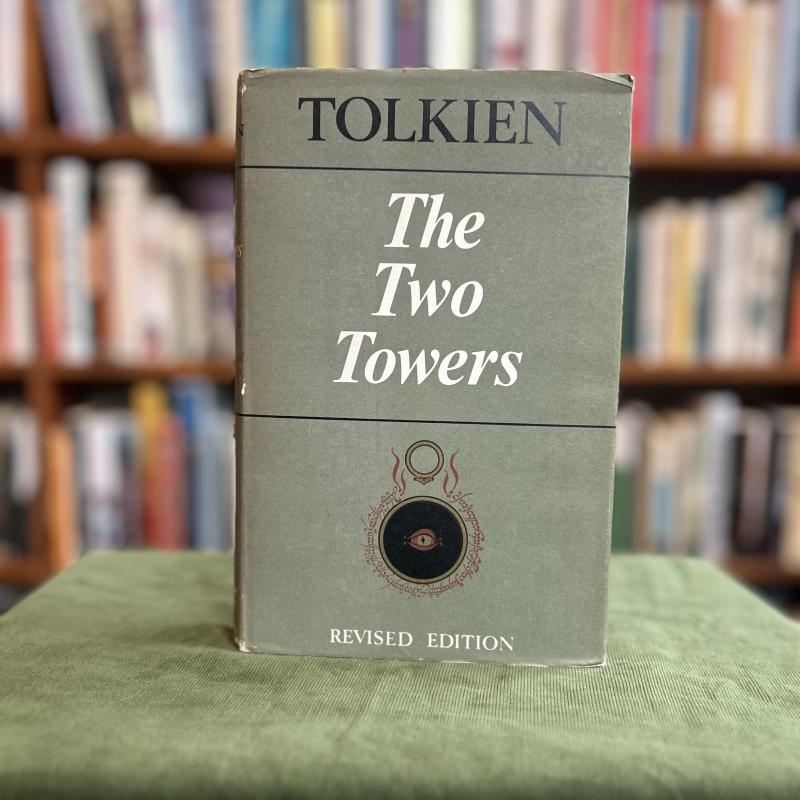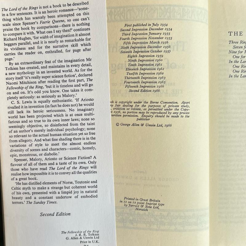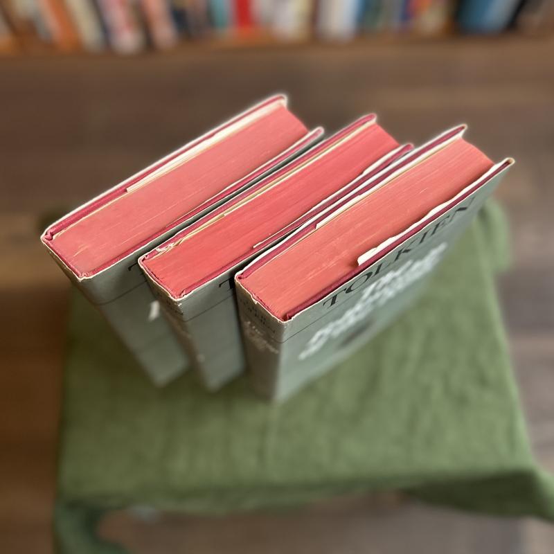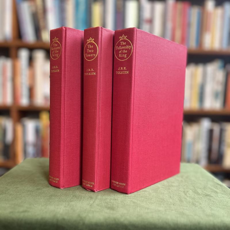Jackets edgeworn, most notable on Two Towers. Slight bow to corners of boards on Two Towers and Return of the King. Tiny crease and open tear to top right corner of jacket on Two Towers. Previous owner’s ex-library stamp to corners of endpapers, concealed by jacket flap. Gilt title and insignia remain bright.