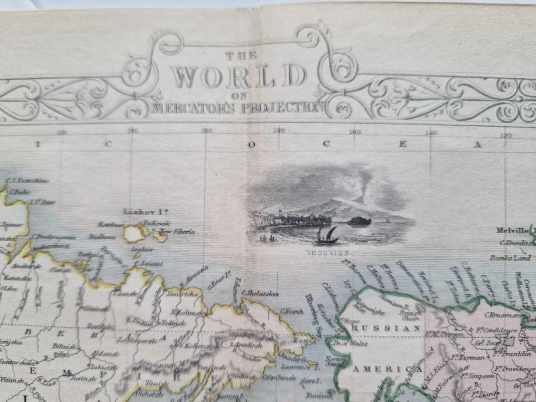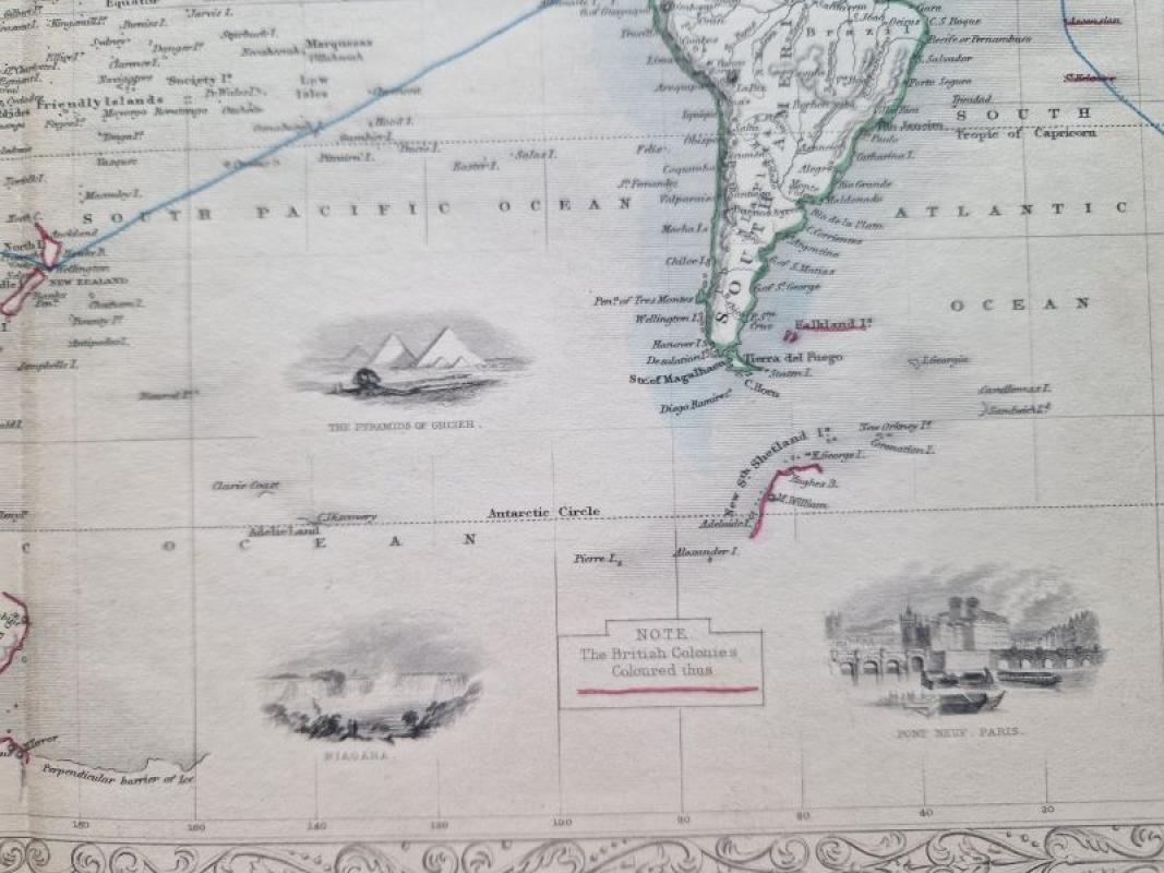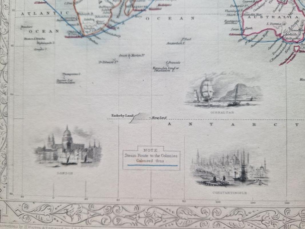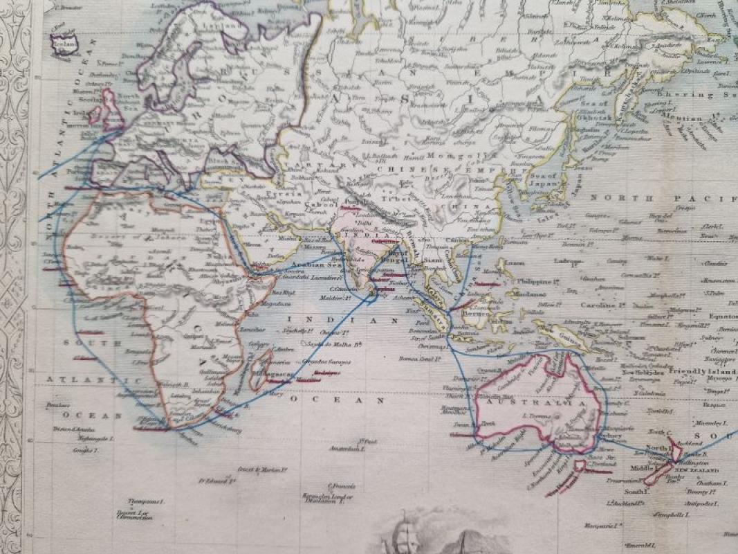 The map shows the World on Mercator's Projection, and is surrounded by a very decorative border. Some vignettes within the image, depicting indigenous animals, various costumes and sites. NB: British Possessions are coloured in pink wash colour! Steam route to the Colonies is coloured in as a blue line.