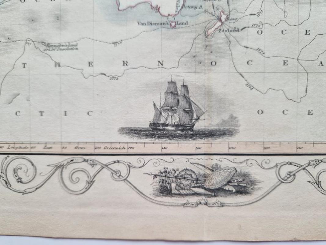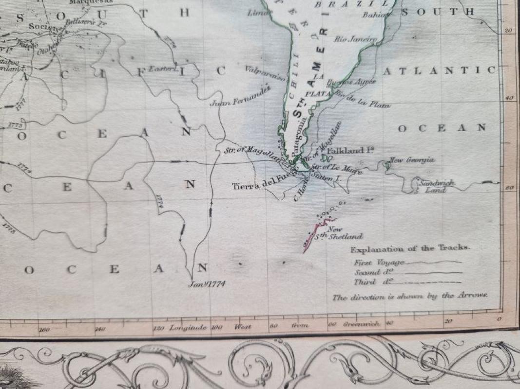 The map shows the World on Mercator's Projection with the outline of Capt. Cook's routes on his three voyages; the map is surrounded by a decorative border and a small depiction of his ship in the lower part of the map.