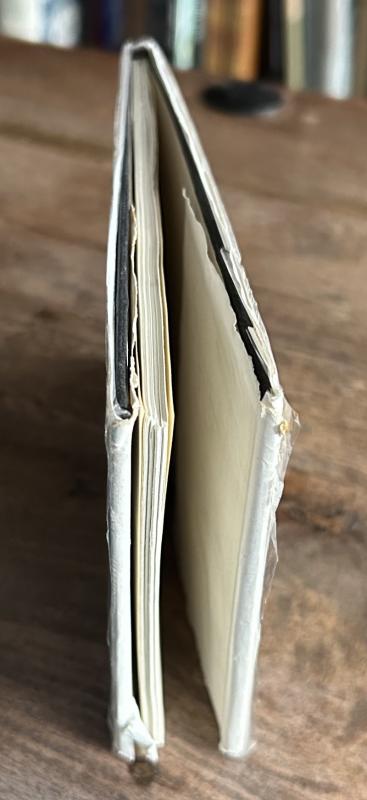 The unclipped dust jacket, protected in a clear, removable cover is in fair condition with a small tear to the top edge of the front return, two tears to the bottom corner for the front return, nibbling to the top edge of the front cover, a tear to the bottom edge of the front cover, crease marks to the spine, and a tear to the edge of the back cover.