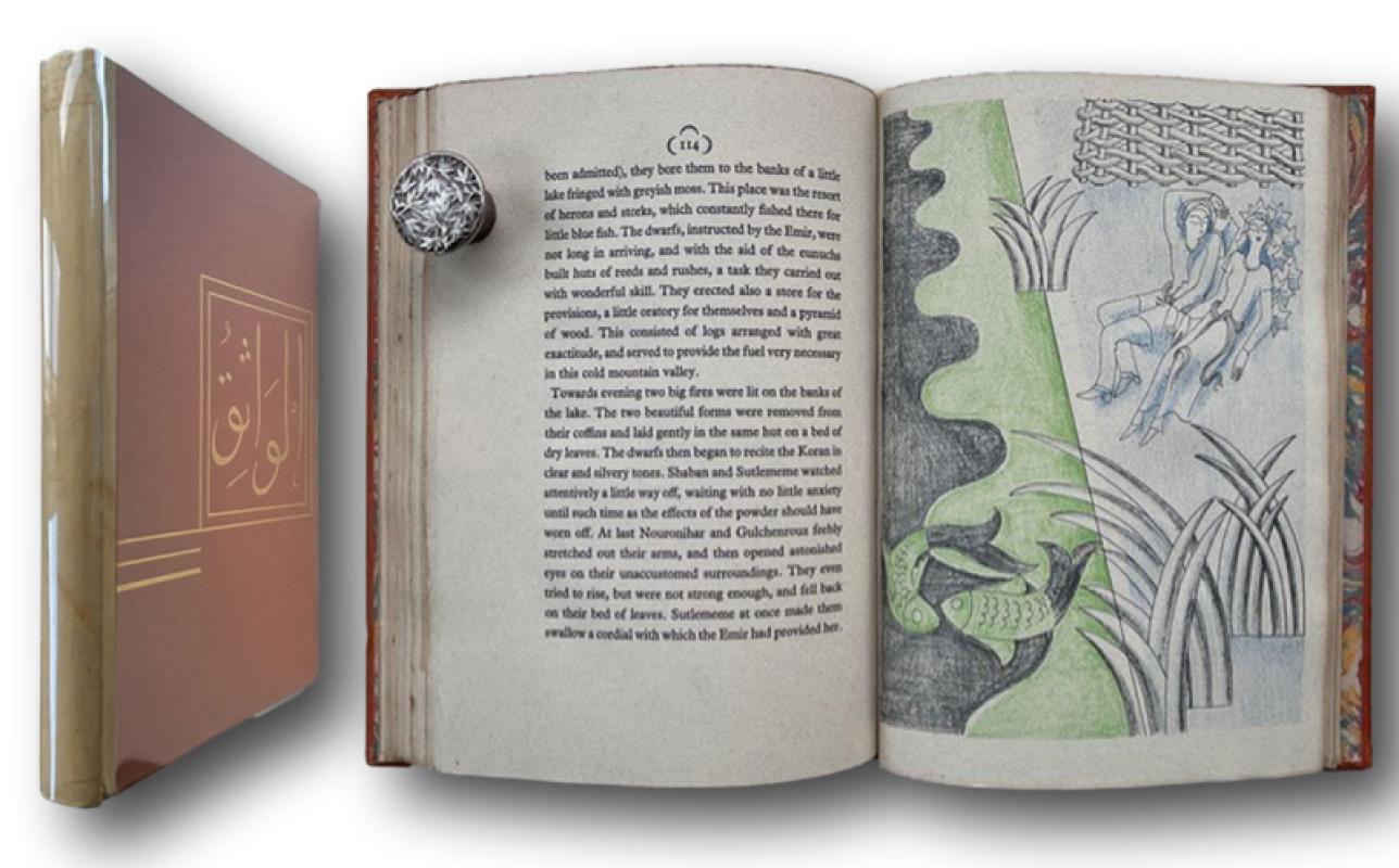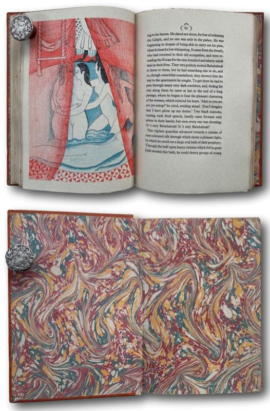 An excellent copy of the striking Nonesuch Press edition illustrated by Marion V. Dorn and beautifully lithographed at the Curwen Press in a numbered Limited [ No 752 ] Edition for sale in England and the US. Quarter Velum over blocked orange boards with marbled end-papers and top edge gilt. Cr.172pps + Collophon. In a protective Glassine wrapper