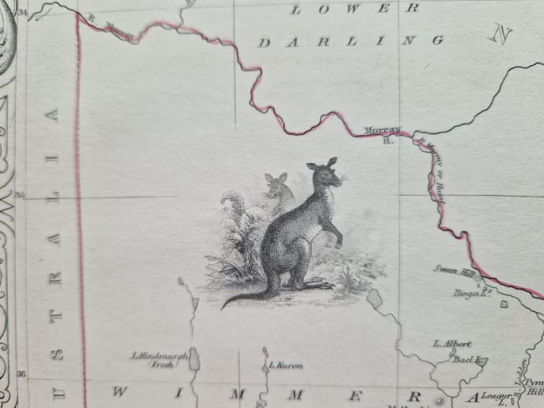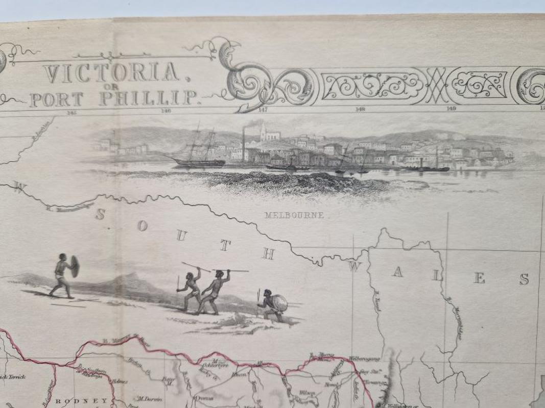 The map shows the area of Victoria with Melbourne; it is surrounded by a very decorative border. Some vignettes within the image, depicting indigenous animals, various costumes and sites.