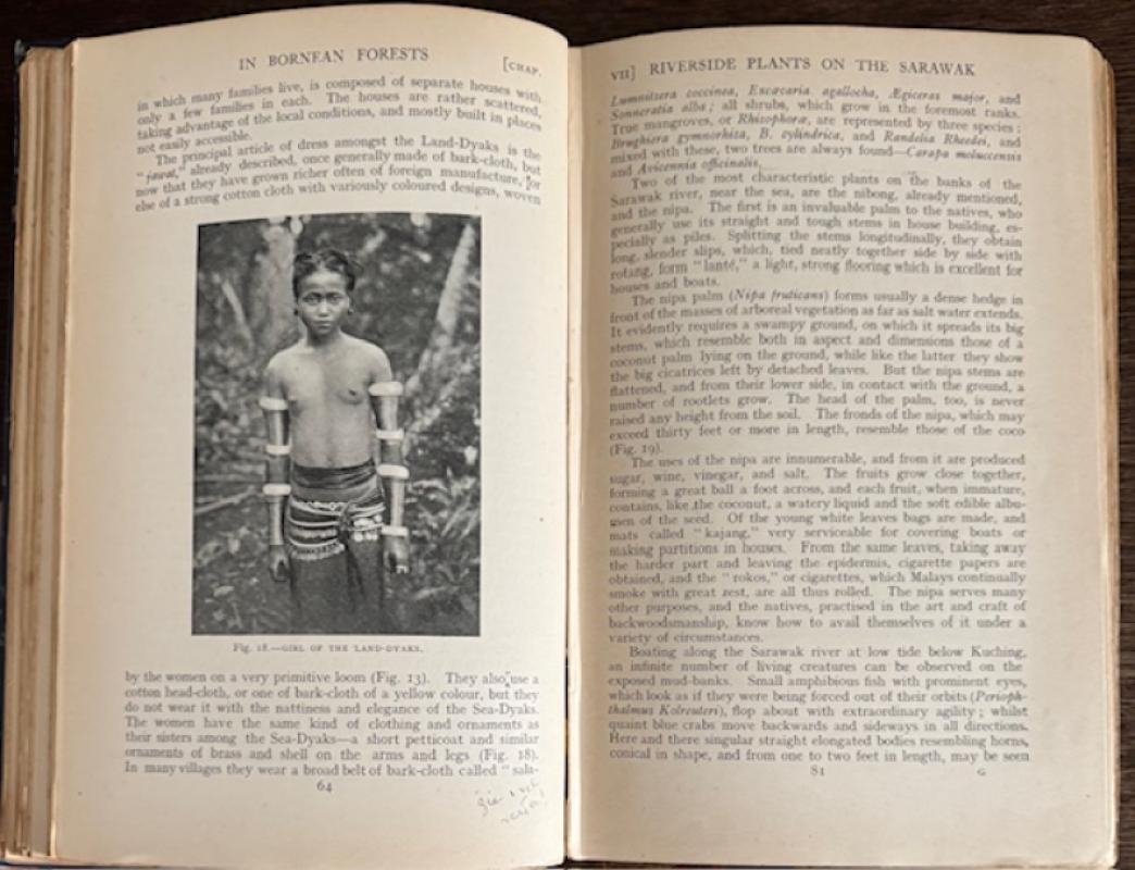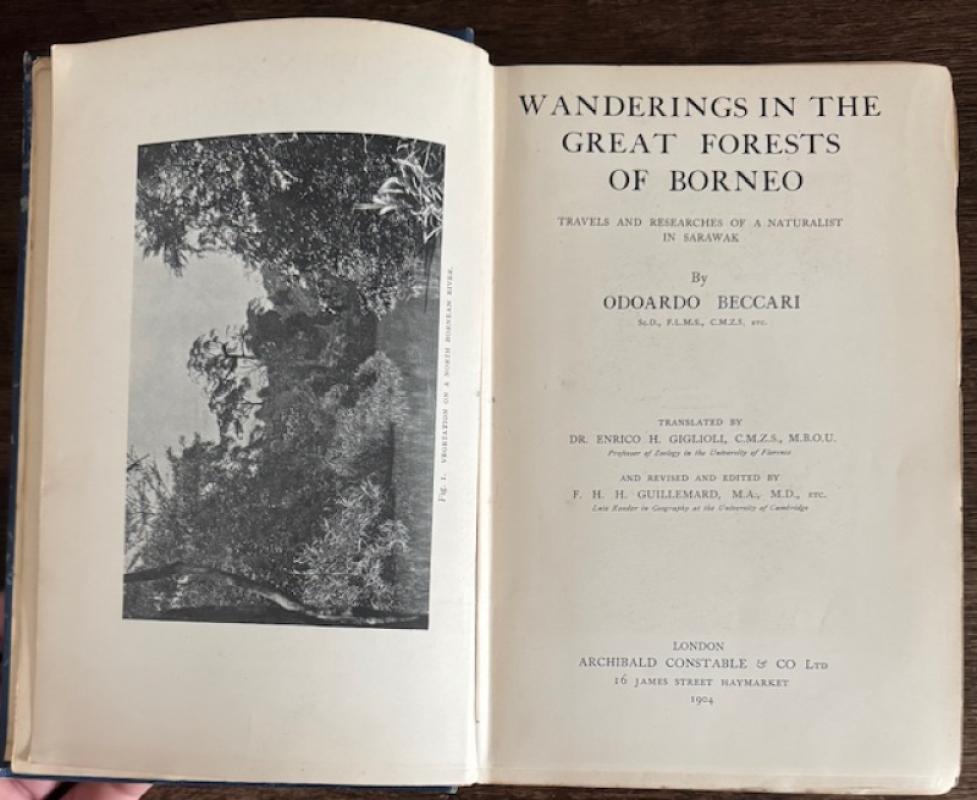 Fine copy of this important work by one of the great botanical explorers and naturalists of the nineteenth century, the Italian botanist Odoardo Beccari (1843-1920) who spent time in Kew Botanical Gardens in early 1865 to study the natural history collectons in preparation of his forthcoming expedition to Borneo (Malaysia). Here he met Charles Darwin, William Joseph Hooker and James Brooke, the Rajah of Sarawak. The latter lead him to spending 3 years from 1865 to 1868 undertaking research in Sarawak, Brunei and other islands off present-day Malaysia and New Guinea, where he discovered many new species of palms, and many other plants such as a phosphorescent fungus that was bright enough to read a newspaper placed by it. His pioneering explorations in the Malaysian Archipelago were grounbreaking. During this period, he collected many thousands of botanical, zoological and ethno-anthropological specimens which are now conserved in natural history museums. Based on this conserved material, hundreds of species new to science have been described. In the work he reflects on nature, the local Dyaks and their customs in some detail and he describes his return to Sarawak some 20 years later, where he formed a botanical garden. He discovered the titan arum, the plant with the largest unbranched inflorescence in the world, in Sumatra in 1878. This edition also contains the valuable and detailed appendix on the forests of Borneo, which are currently being logged to extinction. Contains an index.