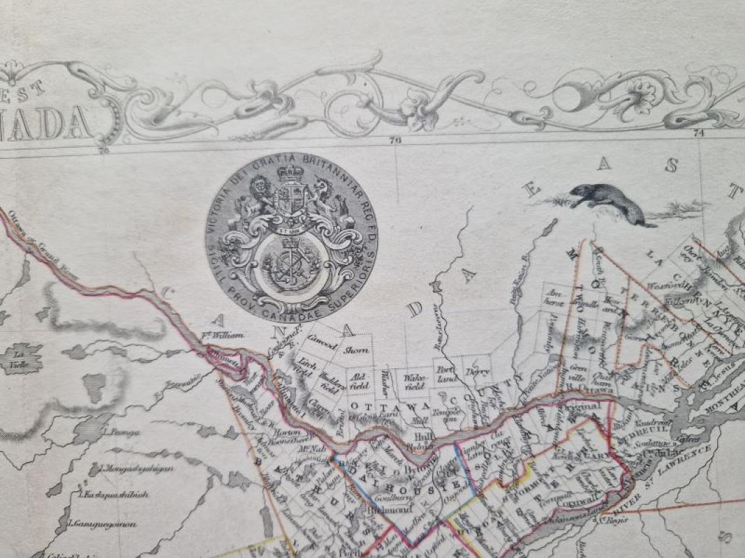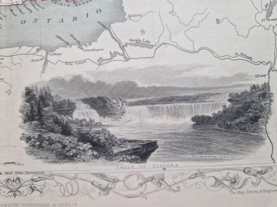 The map shows Western Canada with Niagara Falls; it is surrounded by a very decorative border, and some vignettes within the image, depicting indigenous animals, various costumes and sites.